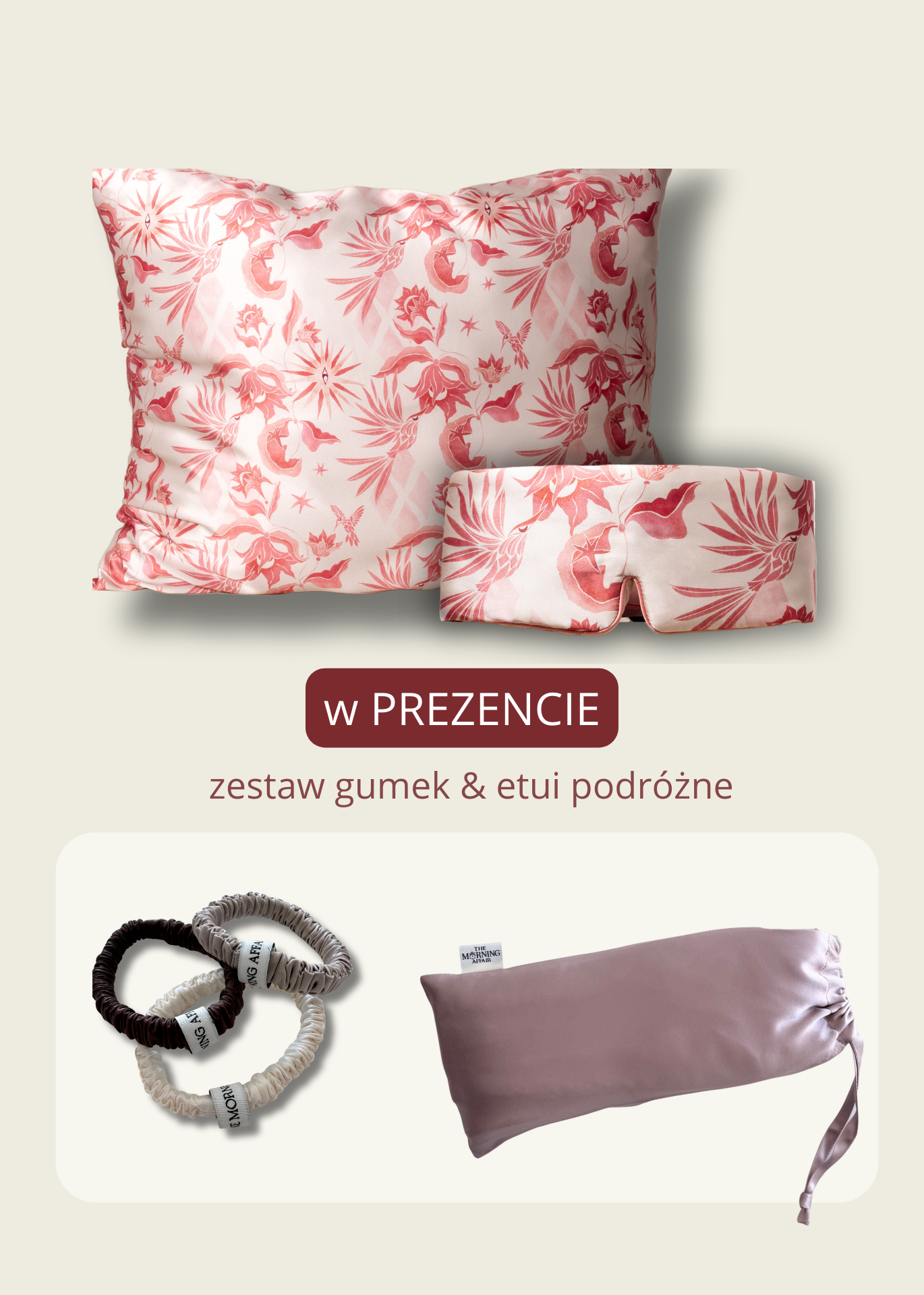 Zestaw all-in-one to dwa bestsellerowe produkty The Morning Affair: jedwabna poszewka na poduszkę Sleepyhead i jedwabna opaska na oczy do spania Wrap & Nap. W prezencie otrzymujesz zestaw trzech jedwabnych gumek do włosów i etui podróżne na opaskę. Wartość prezentów to 138zł.